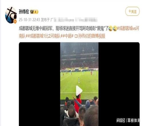而让人诧异的事,在比赛期间,出现展示侮辱性物品、做出侮辱性动作、辱骂等行为,在赛后引发了不小的争议。比赛期间,有部分极端的成都球迷对河南队外援阿奇姆彭做出了带有侮辱性的手势、充满了种族歧视,不少人包括很多的四川球迷都在谴责这样的球迷,而根据最新的处罚规定,这种有视频可查的证据,是可以处罚成都队至少50万、以及其他的处罚包括空场等。